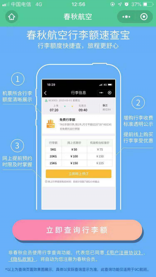乘坐春秋航空航班,你可以自由定制所需要的行李額度。如果你的行李超過機票包含的額度,還可以提前以優(yōu)惠價格,在春秋航空官方渠道購買額外行李額度。此外,春秋航空官方小程序還有“行李額自助查詢與快捷購買”功能。輕松幾步,即可了解每張機票所包含免費或付費行李的重要信息。