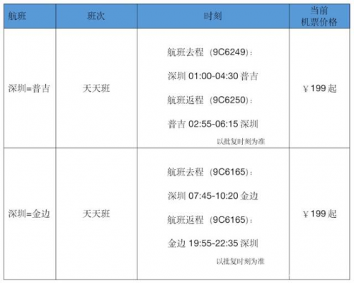 2019年至2020年冬春,春秋航空還將開通深圳至泰國普吉的直飛航線,同時,深圳飛柬埔寨金邊航線將從目前的每天1班加密至每天2班。此外,南京、西安都將分別開通飛往金邊的航線。以上都將從2019年10月27日起開始執(zhí)行。
