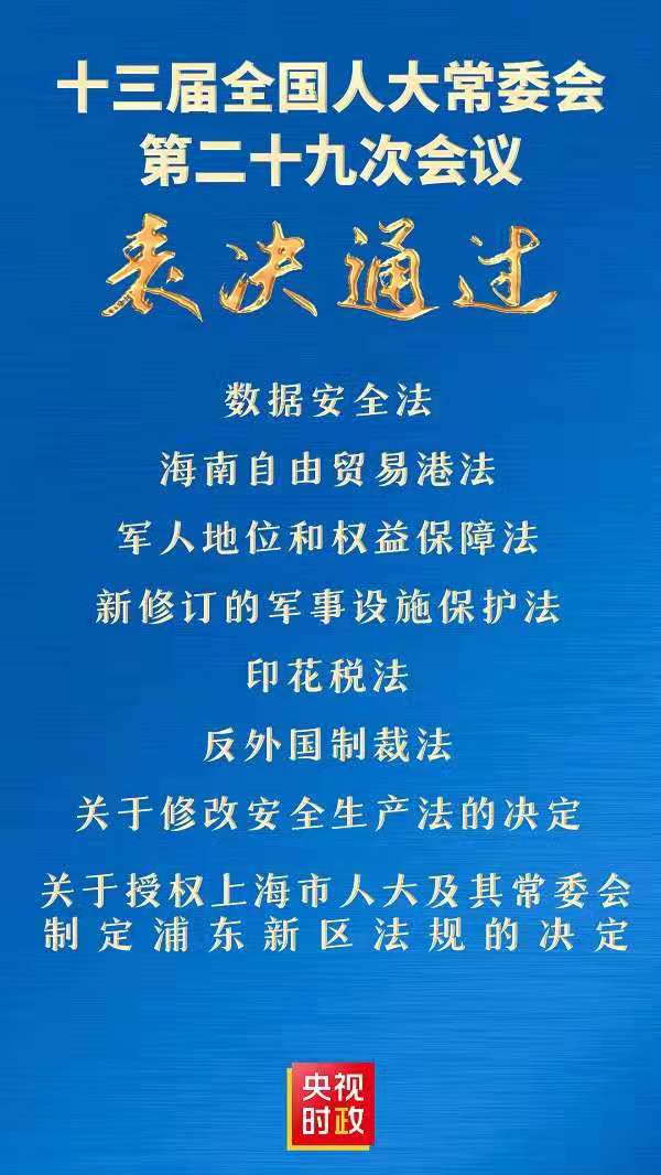 央視新聞6月10日消息,十三屆全國人大常委會第二十九次會議表決通過多項法案及兩項決定。