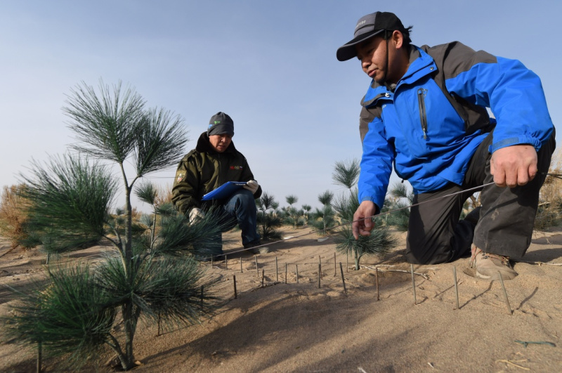 ▲2016年11月21日,在巴丹吉林沙漠東南緣的民勤沙生植物園,甘肅省民勤治沙綜合試驗站工作人員在仿真固沙灌木固沙試驗區(qū)測量固沙數(shù)據(jù)。