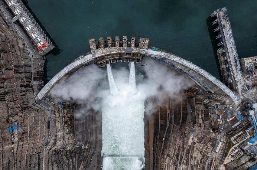 6月28日拍攝的正在發(fā)電運行的白鶴灘水電站。