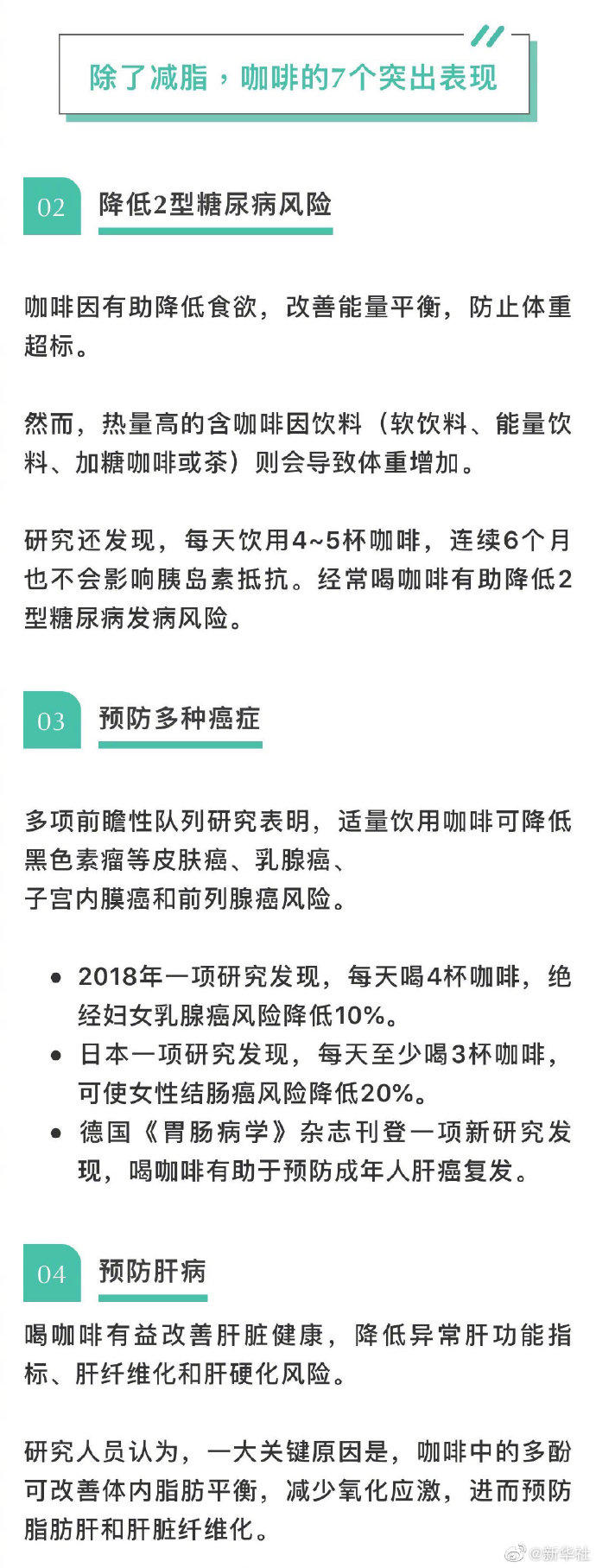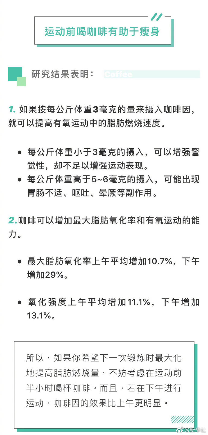 近日,發(fā)表在《國際運動營養(yǎng)學會雜志》的一項研究顯示,在進行有氧運動前半小時攝入咖啡因(3毫克/公斤,相當于一杯濃咖啡),能顯著提高脂肪燃燒的速度,尤其是在下午。戳圖告訴你怎么喝咖啡才能輔助燃脂。此外,研究稱喝咖啡預防多種癌癥。(生命時報)