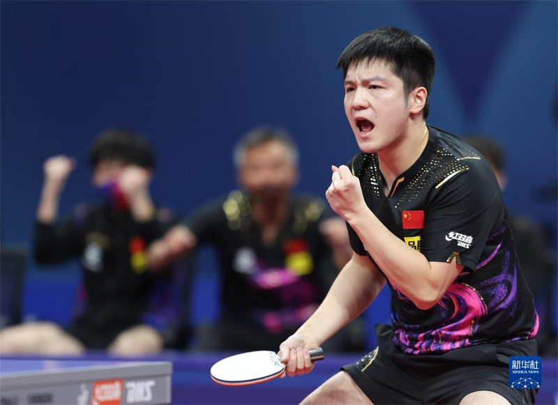 10月9日,中國(guó)隊(duì)選手樊振東在比賽中慶祝得分,他以3比0戰(zhàn)勝德國(guó)隊(duì)選手貝內(nèi)迪克特·杜達(dá)。新華社記者 江宏景 攝