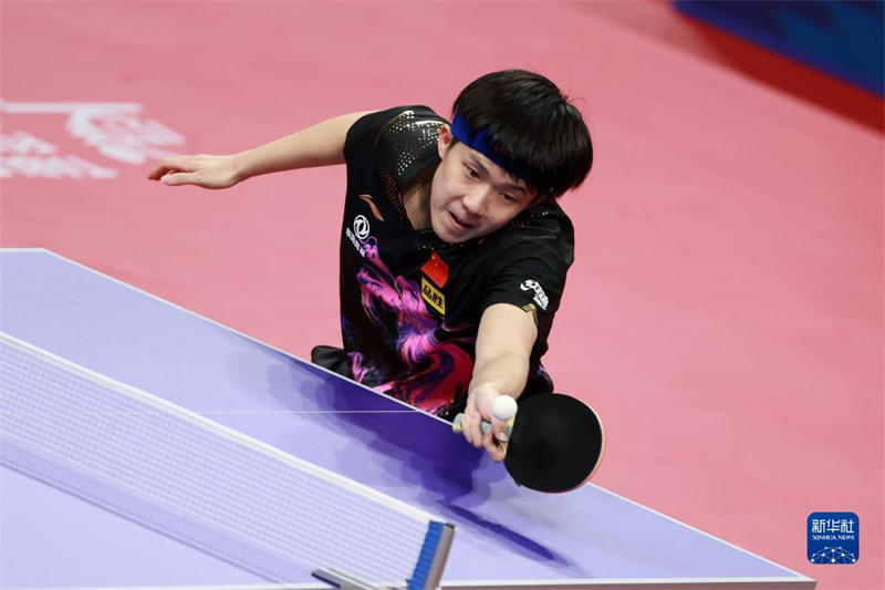 10月9日,中國(guó)隊(duì)選手王楚欽在比賽中回球,他以3比0戰(zhàn)勝德國(guó)隊(duì)選手凱·斯達(dá)姆珀。新華社記者 胥冰潔 攝