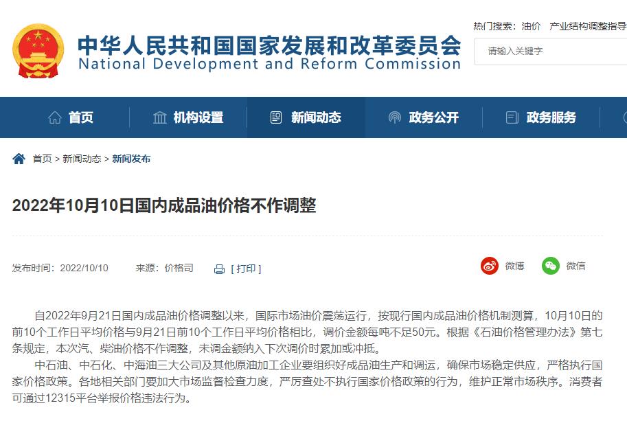 據(jù)國家發(fā)改委網(wǎng)站消息,自2022年9月21日國內(nèi)成品油價(jià)格調(diào)整以來,國際市場(chǎng)油價(jià)震蕩運(yùn)行,按現(xiàn)行國內(nèi)成品油價(jià)格機(jī)制測(cè)算,10月10日的前10個(gè)工作日平均價(jià)格與9月21日前10個(gè)工作日平均價(jià)格相比,調(diào)價(jià)金額每噸不足50元。根據(jù)《石油價(jià)格管理辦法》第七條規(guī)定,本次汽、柴油價(jià)格不作調(diào)整,未調(diào)金額納入下次調(diào)價(jià)時(shí)累加或沖抵。