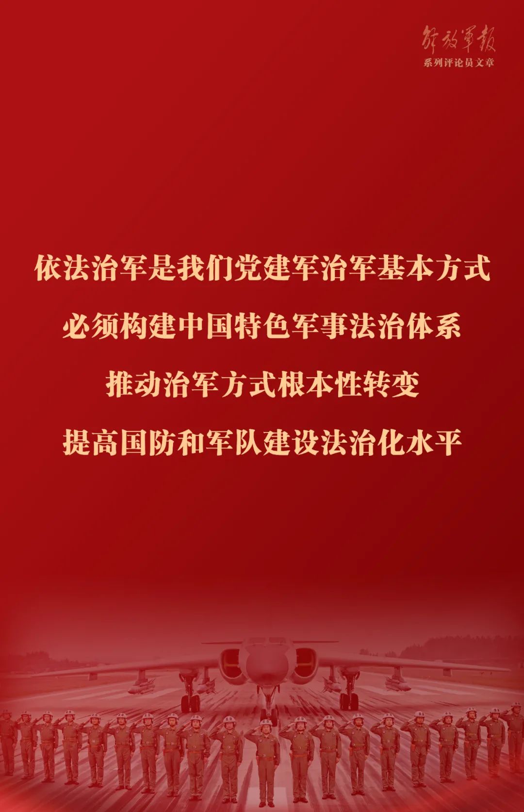 一支現(xiàn)代化軍隊必然是法治軍隊。依法治軍是我們黨建軍治軍的基本方式,是實現(xiàn)黨在新時代的強軍目標的必然要求。實施依法治軍戰(zhàn)略,必須堅持黨對軍隊絕對領導,堅持戰(zhàn)斗力標準,堅持建設中國特色軍事法治體系,堅持按照法治要求轉變治軍方式,堅持從嚴治軍鐵律,堅持抓住領導干部這個“關鍵少數”,堅持官兵主體地位,堅持貫徹全面依法治國要求,提高國防和軍隊建設法治化水平,為推進強軍事業(yè)提供堅強法治保障。