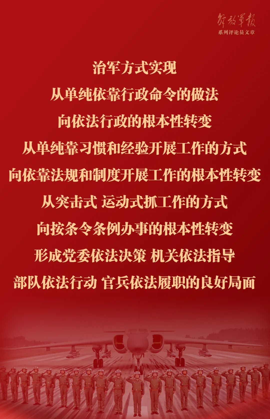 提高國防和軍隊建設法治化水平,要求治軍方式發(fā)生一場深刻變革,實現(xiàn)從單純依靠行政命令的做法向依法行政的根本性轉變,從單純靠習慣和經驗開展工作的方式向依靠法規(guī)和制度開展工作的根本性轉變,從突擊式、運動式抓工作的方式向按條令條例辦事的根本性轉變,形成黨委依法決策、機關依法指導、部隊依法行動、官兵依法履職的良好局面。