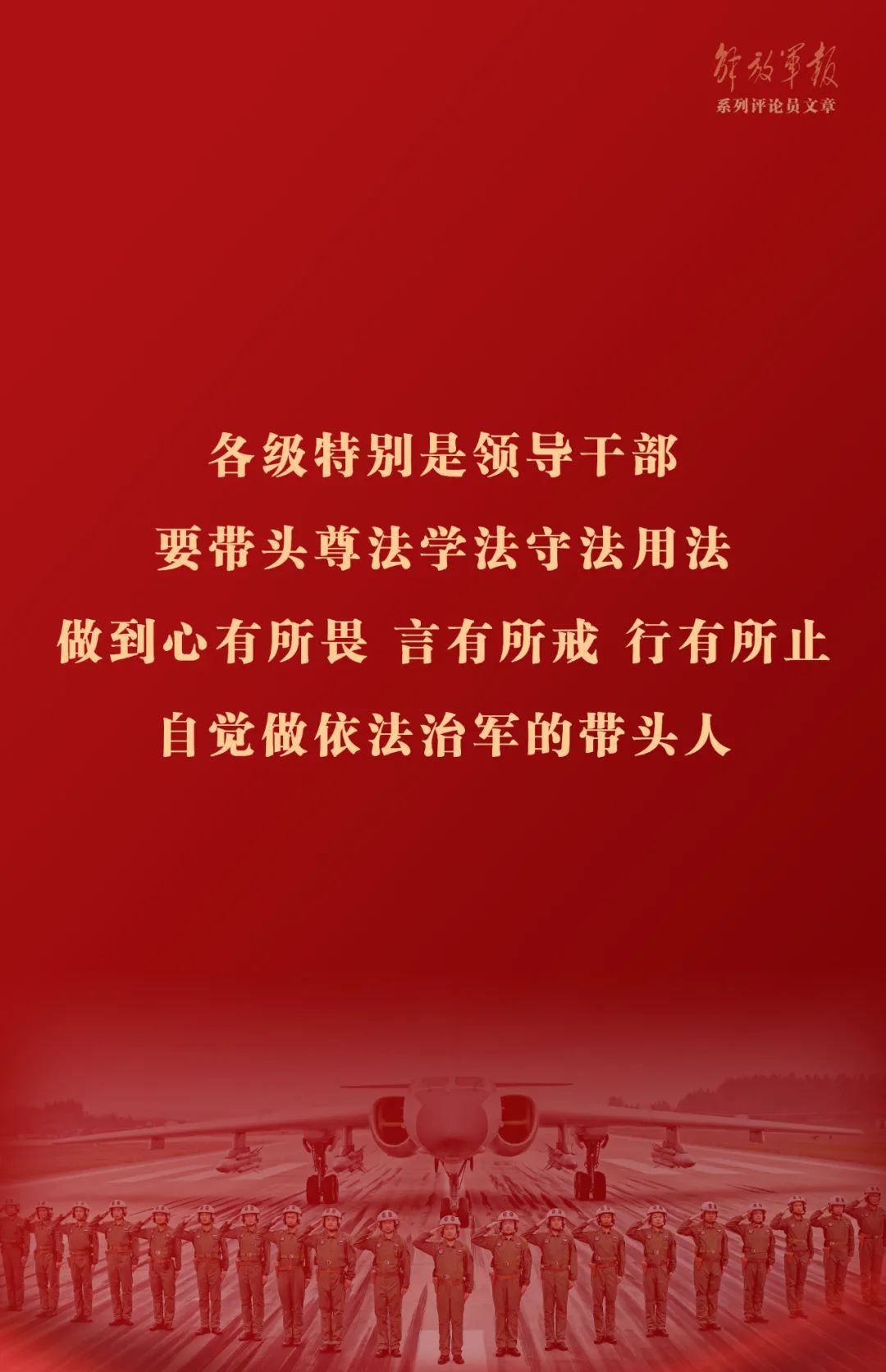 依法治官、依法治權,是依法治軍的關鍵。各級特別是領導干部要帶頭尊法學法守法用法,做到心有所畏、言有所戒、行有所止,自覺做依法治軍的帶頭人。努力學習法律法規(guī)和條令條例,明確法律紅線,嚴格按原則、按政策、按規(guī)矩、按程序辦事,按規(guī)則正確用權、謹慎用權、干凈用權,想問題、作決策、辦事情都要納入法治軌道,確保權力在法治軌道上運行。