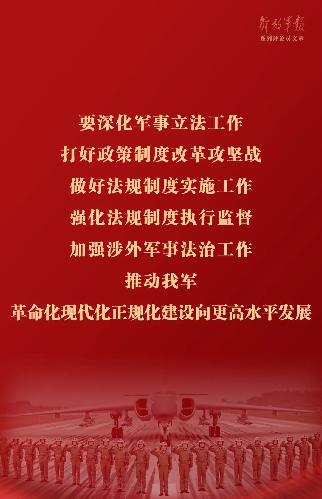 軍隊越是現(xiàn)代化,越是信息化,越是要法治化。黨的二十大提出,要加強依法治軍機制建設和戰(zhàn)略規(guī)劃,完善中國特色軍事法治體系。全軍要全面貫徹依法治軍戰(zhàn)略,統(tǒng)籌全局、突出重點,以重點突破帶動整體推進。要深化軍事立法工作,打好政策制度改革攻堅戰(zhàn),做好法規(guī)制度實施工作,強化法規(guī)制度執(zhí)行監(jiān)督,加強涉外軍事法治工作,推動我軍革命化現(xiàn)代化正規(guī)化建設向更高水平發(fā)展。