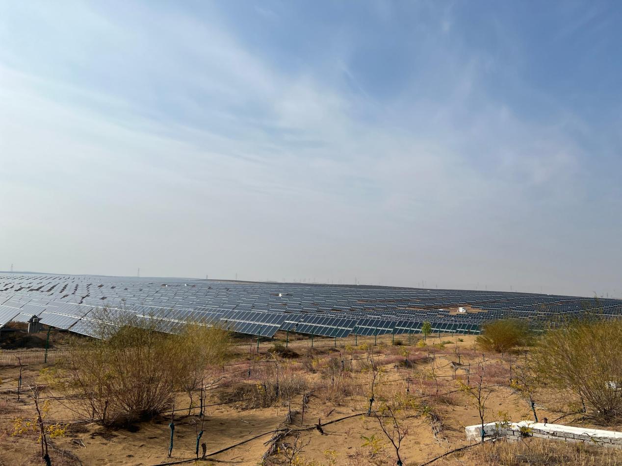庫布其沙漠的腹地,一望無際的光伏板。人民網(wǎng) 歐陽易佳攝