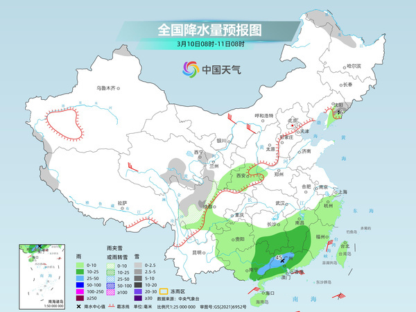 昨天,南方降雨范圍增大、強度增強,華南部分地區(qū)出現(xiàn)較強降雨,北方大部晴朗干燥,西北地區(qū)局地出現(xiàn)較強降雪。監(jiān)測顯示,廣西南部、廣東中北部、江西南部等地出現(xiàn)中到大雨;青海東部、甘肅南部出現(xiàn)小到中雪或雨夾雪,局地大雪。