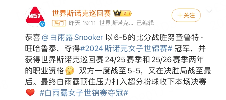 并獲得世界斯諾克巡回賽24/25賽季和25/26賽季兩年的職業(yè)資格。