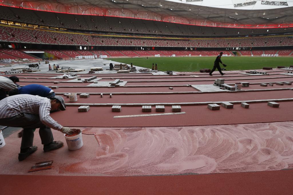 資料圖:2015年3月29日,工作人員在“鳥巢”鋪設專業(yè)預制塑膠跑道,為當年在北京舉行的田徑世錦賽做準備。新華社發(fā)