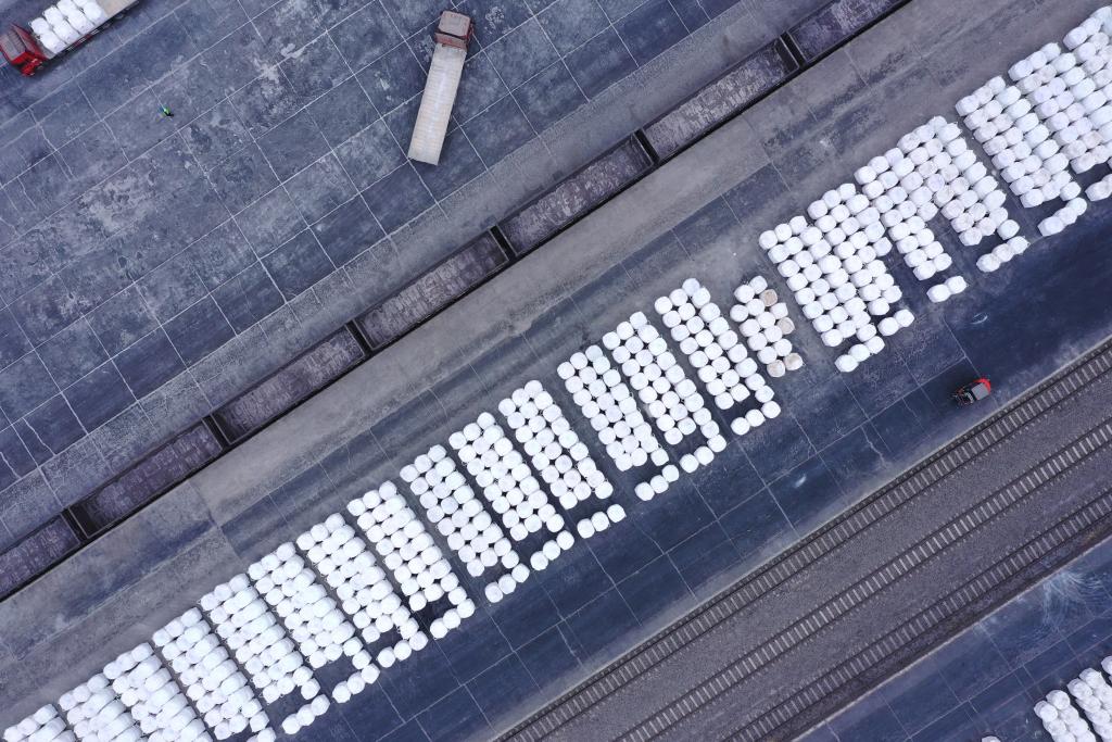 3月14日,在青海鹽湖工業(yè)股份有限公司鉀肥分公司貨場(chǎng),車(chē)輛在裝運(yùn)鉀肥(無(wú)人機(jī)照片)。新華社記者 陳杰 攝