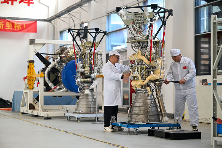 2024年3月11日,在安徽九州云箭航天技術(shù)有限公司生產(chǎn)基地,技術(shù)人員對即將交付的液體火箭發(fā)動機進行最后的檢查。新華社發(fā)(黃洋洋攝)