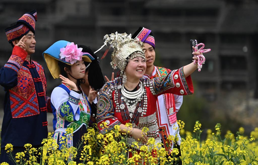 3月14日,游客在貴州省遵義市播州區(qū)烏江寨景區(qū)游覽。新華社記者 楊楹 攝