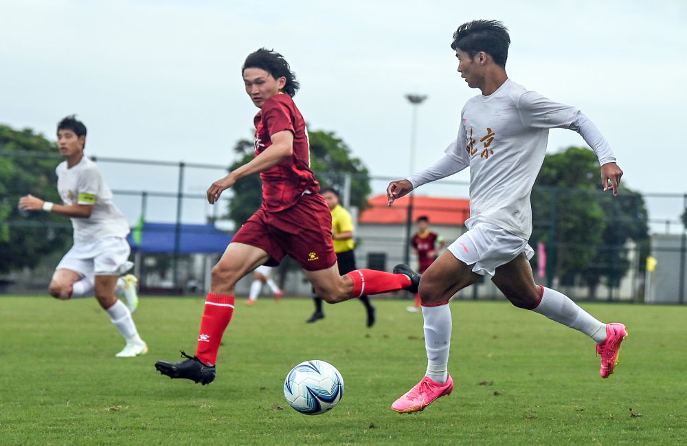2023年11月8日,在第一屆學(xué)生(青年)運(yùn)動(dòng)會(huì)足球項(xiàng)目大學(xué)男子組小組賽第二輪比賽中,北京隊(duì)以2:0戰(zhàn)勝重慶隊(duì)。圖為北京隊(duì)球員錢(qián)誠(chéng)(右)在比賽中帶球突破。新華社記者 張愛(ài)林 攝