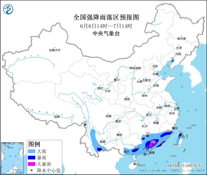 中新網(wǎng)6月6日電 據(jù)中央氣象臺網(wǎng)站消息,中央氣象臺6月6日10時繼續(xù)發(fā)布暴雨黃色預警:預計,6月6日14時至7日14時,湖南南部、江西南部、廣西南部和東部、廣東、福建中南部、臺灣島西部以及云南中西部、遼寧南部等地部分地區(qū)有大到暴雨,其中,廣東中東部等地部分地區(qū)有大暴雨(100~180毫米)。上述部分地區(qū)伴有短時強降水(最大小時降雨量30~60毫米,局地可超過80毫米),局地有雷暴大風等強對流天氣。