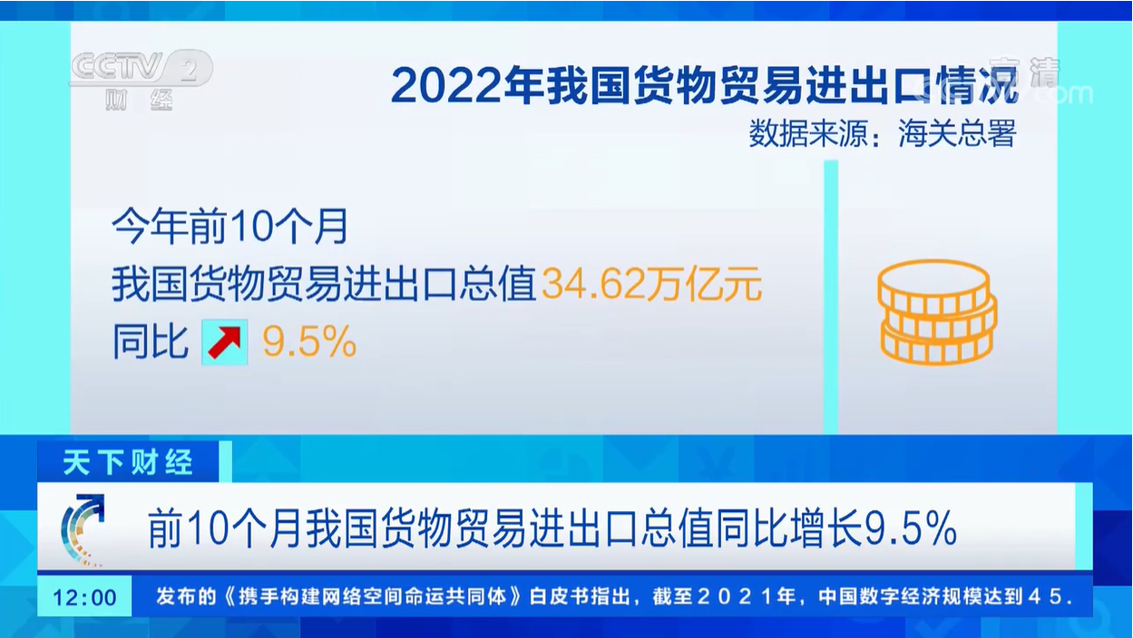 據(jù)海關(guān)統(tǒng)計(jì),今年前10個(gè)月,我國(guó)貨物貿(mào)易進(jìn)出口總值34.62萬(wàn)億元,同比增長(zhǎng)9.5%。其中,出口19.71萬(wàn)億元,同比增長(zhǎng)13%;進(jìn)口14.91萬(wàn)億元,同比增長(zhǎng)5.2%。