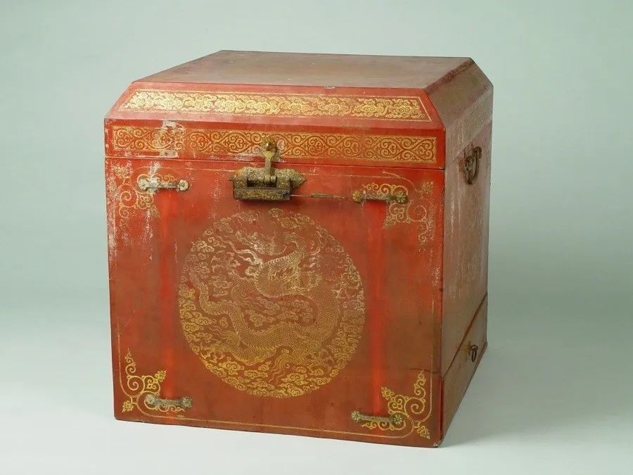 因此戧(qiàng)金云龍紋朱漆盝(lù)頂箱
