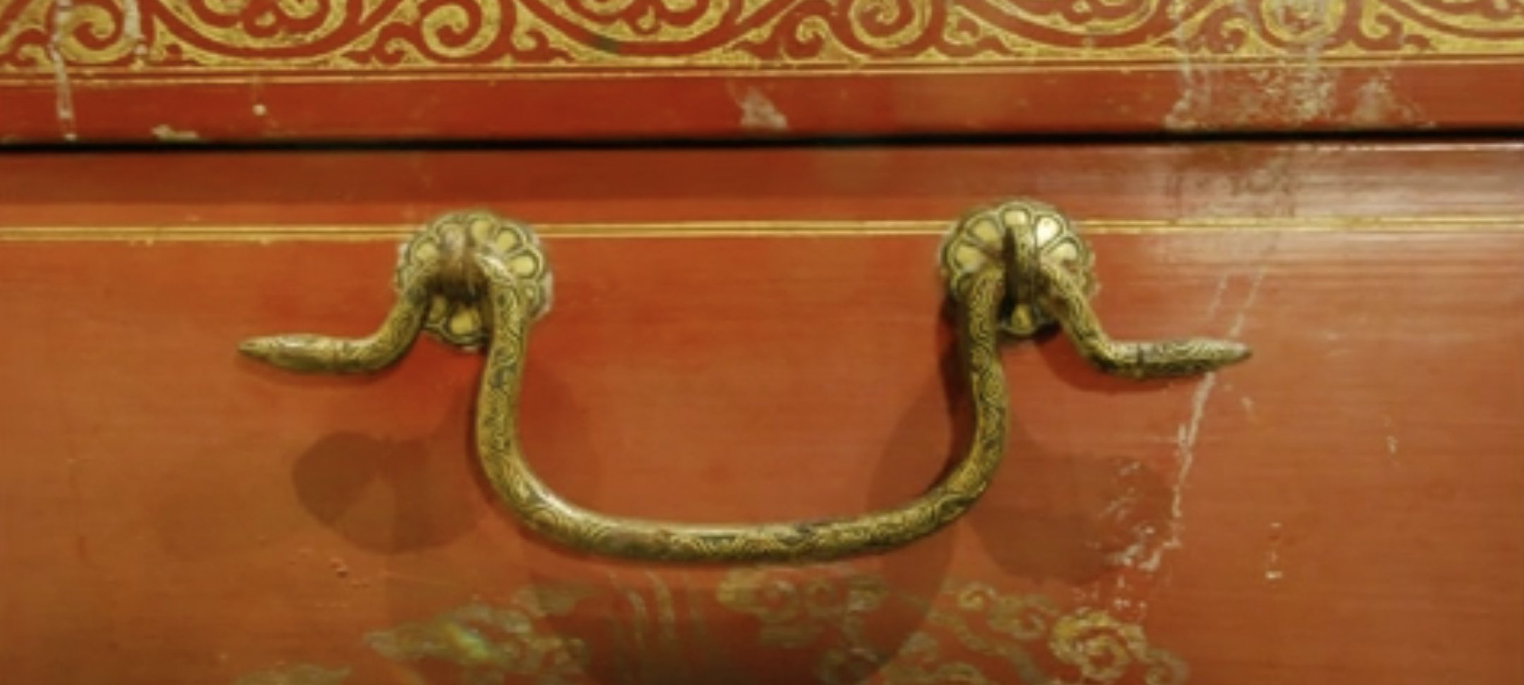 木箱左右兩側(cè)上部的蛇形描金提梁(把手)