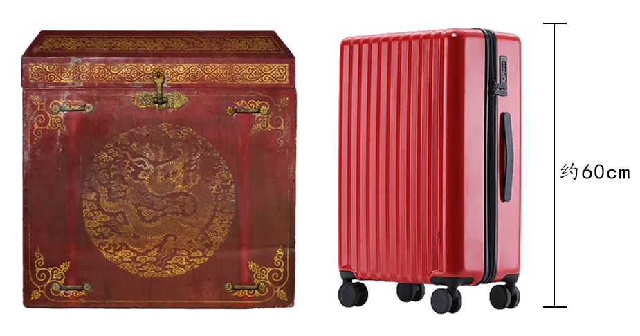 △ 戧(qiàng)金云龍紋朱漆盝(lù)頂箱與一個(gè)24寸行李箱的高度差不多