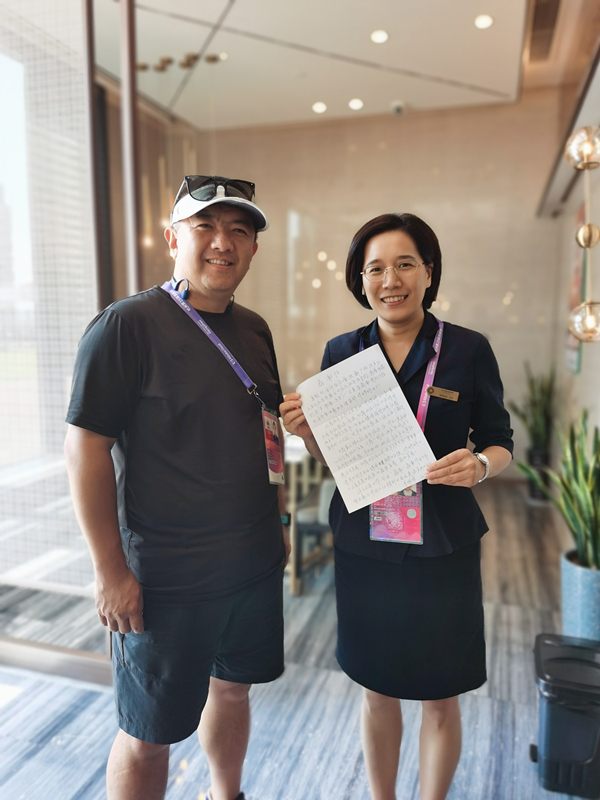 收到感謝信,鄧娉婷也是深受觸動,“媒體記者在前方努力地宣傳亞運,作為酒店來說就是他們的后方保障基地,讓他們回到酒店之后得到一個如家一樣的照顧,吃得順心住得舒心。作為酒店從業(yè)者,第一時間親身參與亞運、服務(wù)亞運,我有這么一個機(jī)會,感覺到非常榮幸!