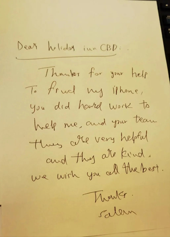 杭州錢江新城假日酒店也收到了來自住店的外籍媒體客人的一封手寫感謝信。9月15日晚上,該名客人在乘坐出租車返回酒店的途中,不慎將手機(jī)遺落在車上。在抵達(dá)酒店后,他急忙反映了這一情況,值班經(jīng)理黃文霞和前廳部主管石聰聰在得知情況后,第一時間聯(lián)系出租車公司,通過多方撥打電話溝通,最終聯(lián)系到了出租車司機(jī),在一個半小時內(nèi)成功幫客人尋回了手機(jī)?腿嗽诩又,以一封手寫感謝信表達(dá)了對假日酒店優(yōu)質(zhì)服務(wù)的贊賞。