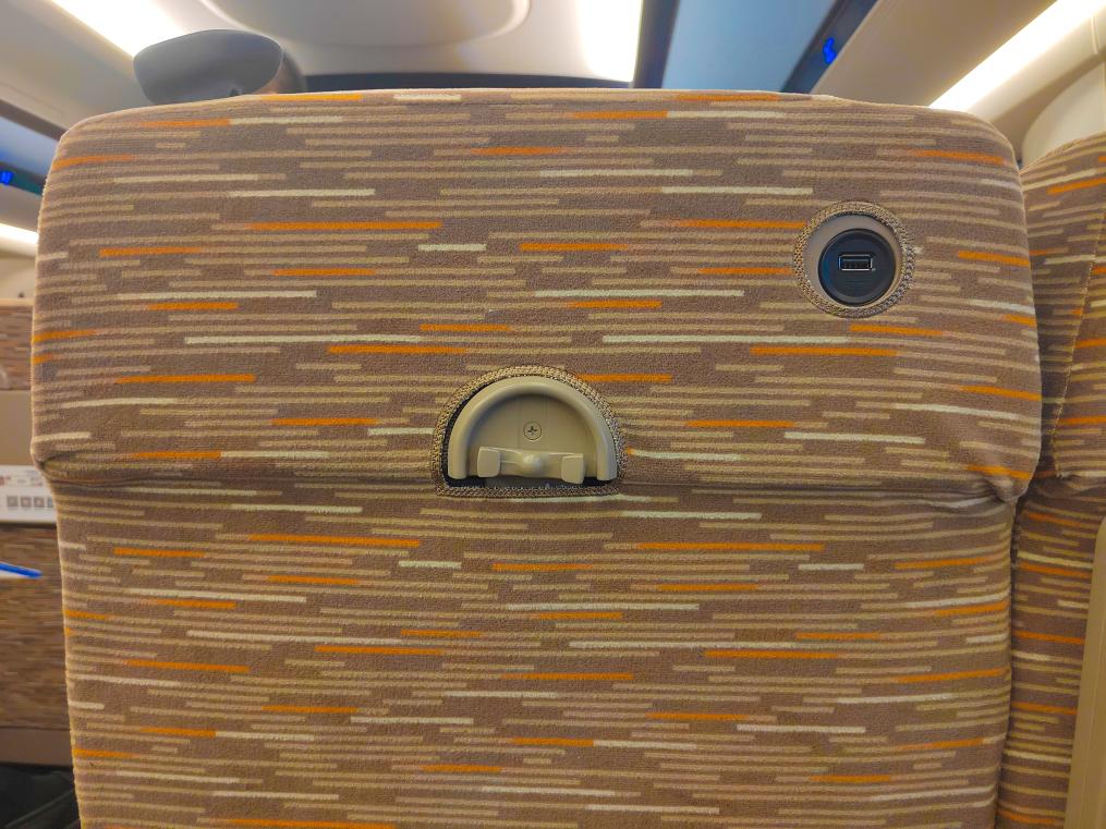 這是9月4日拍攝的福廈高鐵“復(fù)興號”智能動車組二等座座椅上的USB充電接口。新華社記者 周義 攝