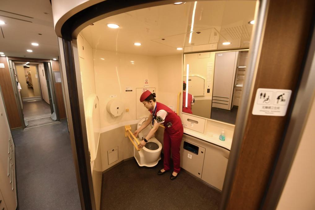 9月4日,福廈高鐵“復(fù)興號”智能動車組列車長余艷在介紹無障礙衛(wèi)生間布局。新華社記者 林善傳 攝