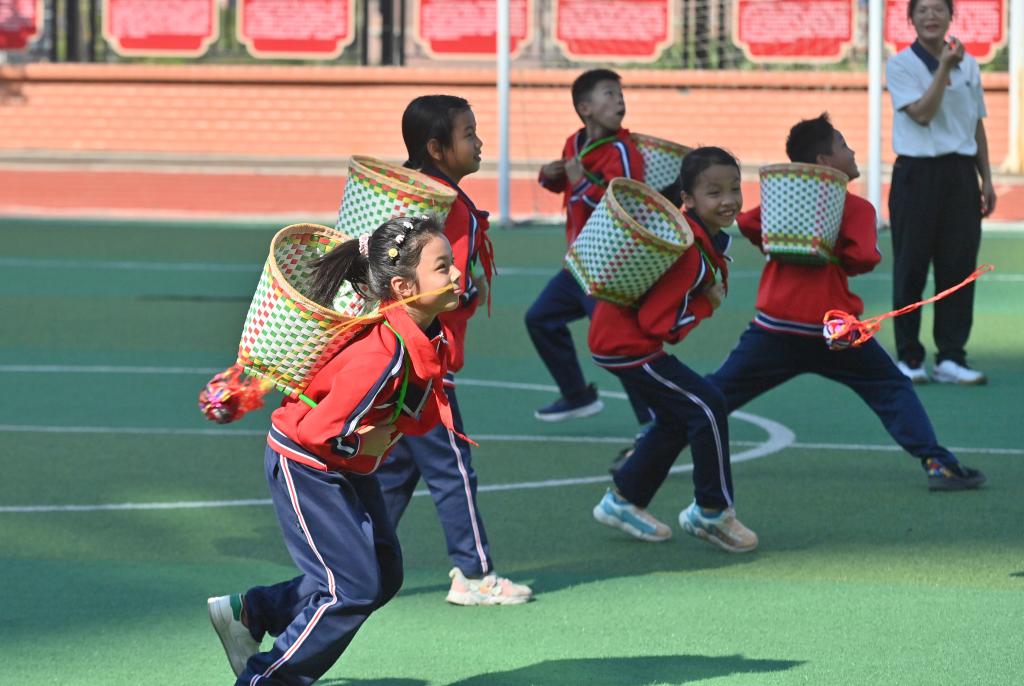 10月16日,在廣西梧州市長洲區(qū)龍平小學(xué),學(xué)生們在體育課上進(jìn)行拋繡球比賽。新華社記者 黃孝邦 攝