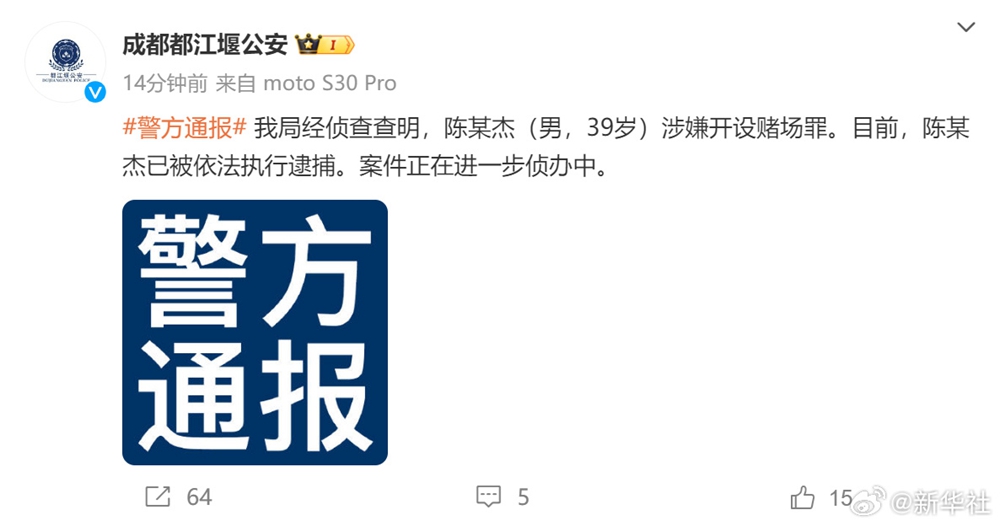 @成都都江堰公安發(fā)布警方通報:我局經(jīng)偵查查明,陳某杰(男,39歲)涉嫌開設(shè)賭場罪。目前,陳某杰已被依法執(zhí)行逮捕。案件正在進一步偵辦中。(記者:董小紅)