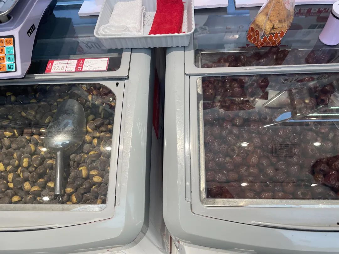 記者來到江蘇無錫某炒貨店,在最顯眼的入口處就擺放著兩個(gè)冰柜,一個(gè)是冰板栗,一個(gè)是凍山楂!皟錾介俏覀兘衲甑男缕,以前都是炒的或者糖霜的!钡陠T向記者極力推薦,當(dāng)問到山楂和板栗是否能一起吃時(shí),店員表示:“不太清楚,應(yīng)該沒關(guān)系。”