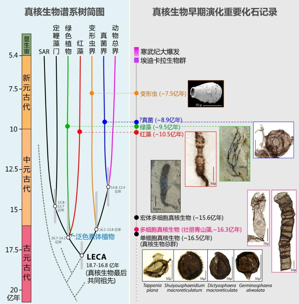 真核生物譜系發(fā)生樹簡化圖和真核生物早期重要化石記錄。真核生物樹中,虛線表示干群真核生物,實線表示冠群真核生物(真核生物最后共同祖先LECA及其所有后裔)。分歧點上的淺灰色條帶表示分子鐘估算的分歧時間,右圖顯示真核生物各類群最早的化石記錄。