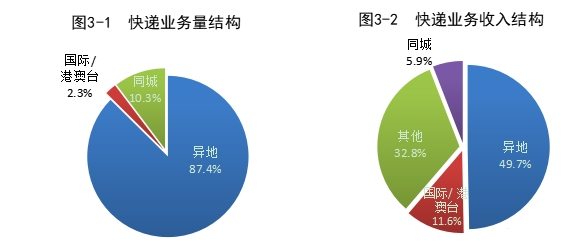 2023年,同城、異地、國際/港澳臺快遞業(yè)務(wù)量分別占全部快遞業(yè)務(wù)量的10.3%、87.4%和2.3%;業(yè)務(wù)收入分別占全部快遞收入的5.9%、49.7%和11.6%。與去年同期相比,同城快遞業(yè)務(wù)量的比重下降1.3個百分點,異地快遞業(yè)務(wù)量的比重上升0.8個百分點,國際/港澳臺業(yè)務(wù)量的比重上升0.5個百分點。