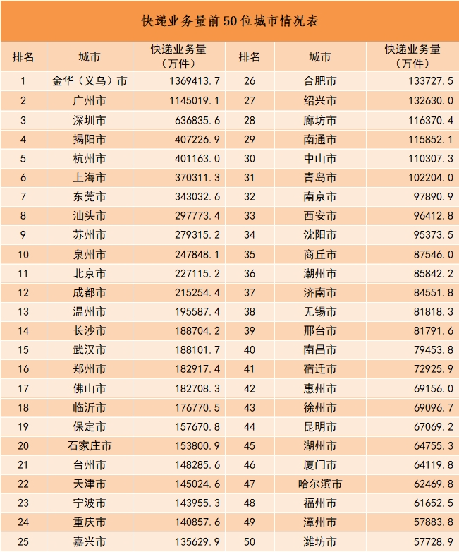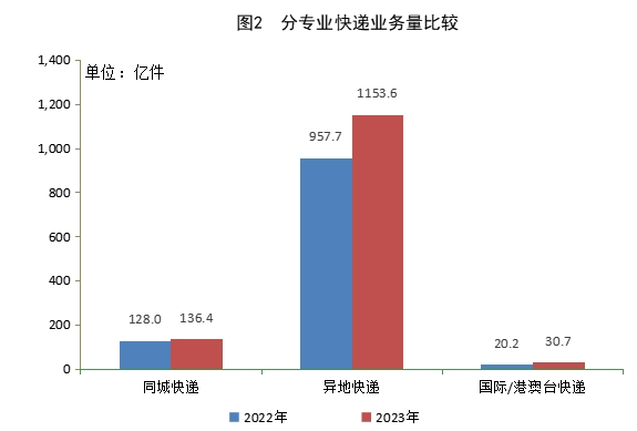 2023年,同城快遞業(yè)務(wù)量累計完成136.4億件,同比增長6.6%;異地快遞業(yè)務(wù)量累計完成1153.6億件,同比增長20.5%;國際/港澳臺快遞業(yè)務(wù)量累計完成30.7億件,同比增長52.0%。