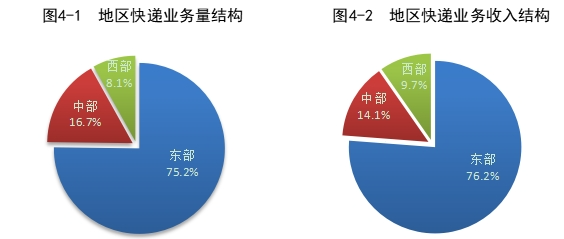 2023年,東、中、西部地區(qū)快遞業(yè)務(wù)量比重分別為75.2%、16.7%和8.1%,業(yè)務(wù)收入比重分別為76.2%、14.1%和9.7%。與去年同期相比,東部地區(qū)快遞業(yè)務(wù)量比重下降1.6個百分點,快遞業(yè)務(wù)收入比重下降1.4個百分點;中部地區(qū)快遞業(yè)務(wù)量比重上升1.0個百分點,快遞業(yè)務(wù)收入比重上升0.7個百分點;西部地區(qū)快遞業(yè)務(wù)量比重上升0.6個百分點,快遞業(yè)務(wù)收入比重上升0.7個百分點。