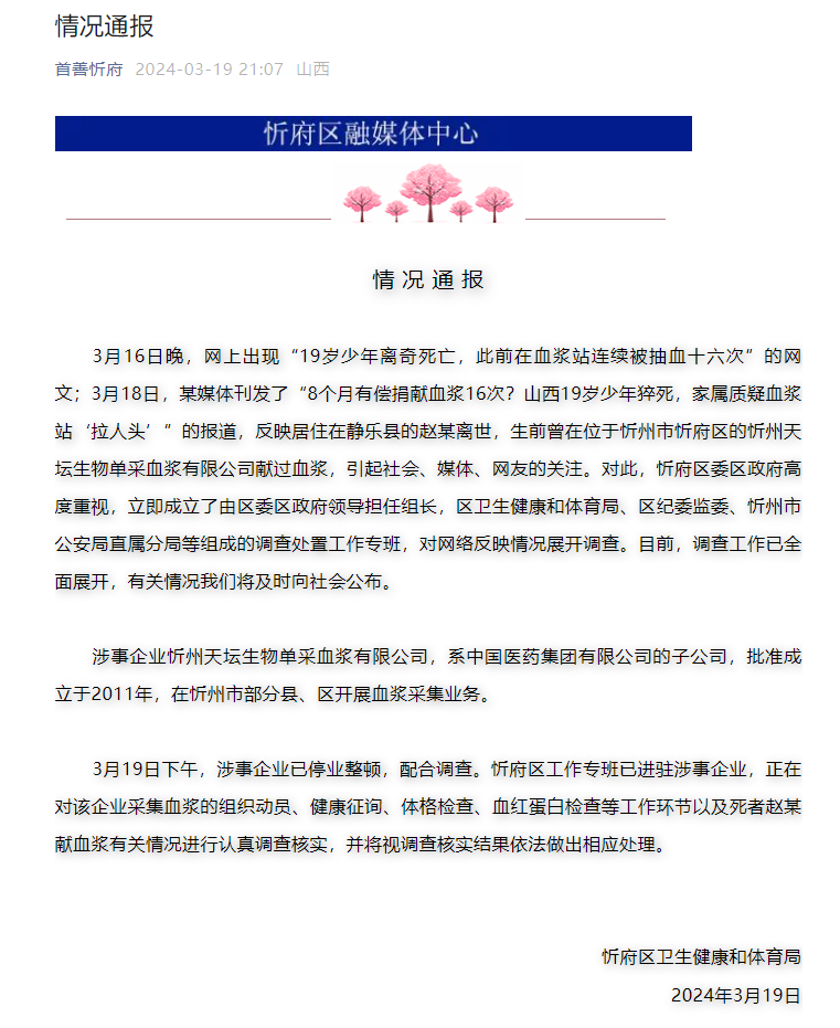 據(jù)山西忻州忻府區(qū)宣傳部官微消息,3月16日晚,網(wǎng)上出現(xiàn)“19歲少年離奇死亡,此前在血漿站連續(xù)被抽血十六次”的網(wǎng)文;3月18日,某媒體刊發(fā)了“8個(gè)月有償捐獻(xiàn)血漿16次?山西19歲少年猝死,家屬質(zhì)疑血漿站‘拉人頭’”的報(bào)道,反映居住在靜樂(lè)縣的趙某離世,生前曾在位于忻州市忻府區(qū)的忻州天壇生物單采血漿有限公司獻(xiàn)過(guò)血漿,引起社會(huì)、媒體、網(wǎng)友的關(guān)注。對(duì)此,忻府區(qū)委區(qū)政府高度重視,立即成立了由區(qū)委區(qū)政府領(lǐng)導(dǎo)擔(dān)任組長(zhǎng),區(qū)衛(wèi)生健康和體育局、區(qū)紀(jì)委監(jiān)委、忻州市公安局直屬分局等組成的調(diào)查處置工作專班,對(duì)網(wǎng)絡(luò)反映情況展開(kāi)調(diào)查。目前,調(diào)查工作已全面展開(kāi),有關(guān)情況我們將及時(shí)向社會(huì)公布。