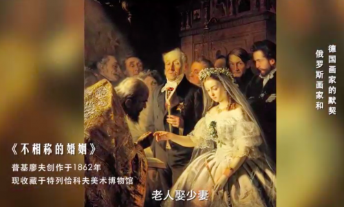 節(jié)目中介紹的畫作是19世紀(jì),俄羅斯畫家普吉廖夫的《不相稱的婚姻》,畫作中的新郎是個駝背禿發(fā)、衣著華貴的老頭,而新娘則是貌美如花、披著白紗卻悶悶不樂的少女,周圍的人都投來輕蔑的眼神,極不看好這段婚姻。這幅畫作反映出那個特殊年代,歐洲社會生活的現(xiàn)實,極具典型意義。也因為這一現(xiàn)象帶來了很多負(fù)面的社會弊端,所以當(dāng)時的東正教,還發(fā)布法令:不允許年齡懸殊太大的婚姻,因為他們得不到真正的幸福。同時,韓玉臣還以偉大的思想家革命家馬克思和他妻子燕妮的故事作為正面典型予以謳歌,馬克思雖出身一般,但燕妮家世好,顏值高,追求者甚多,可她還是選擇了有理想有抱負(fù)的馬克思,哪怕生活窘迫也能真誠守護(hù),相伴一生。