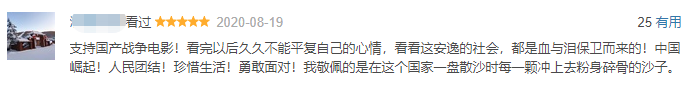 《八佰》成為爆款,一個(gè)重要的原因是它抓住了中國人的家國情懷和抗?fàn)幰庾R(shí),凝聚了中國軍民齊心抵抗外辱的共同情緒。正因?yàn)橛袩o數(shù)八佰壯士一樣的英雄,中華民族才得以最終贏得抗戰(zhàn)勝利。觀眾為80年前以命護(hù)國的平民英雄落淚,實(shí)質(zhì)是發(fā)自肺腑地敬仰抗戰(zhàn)英雄。